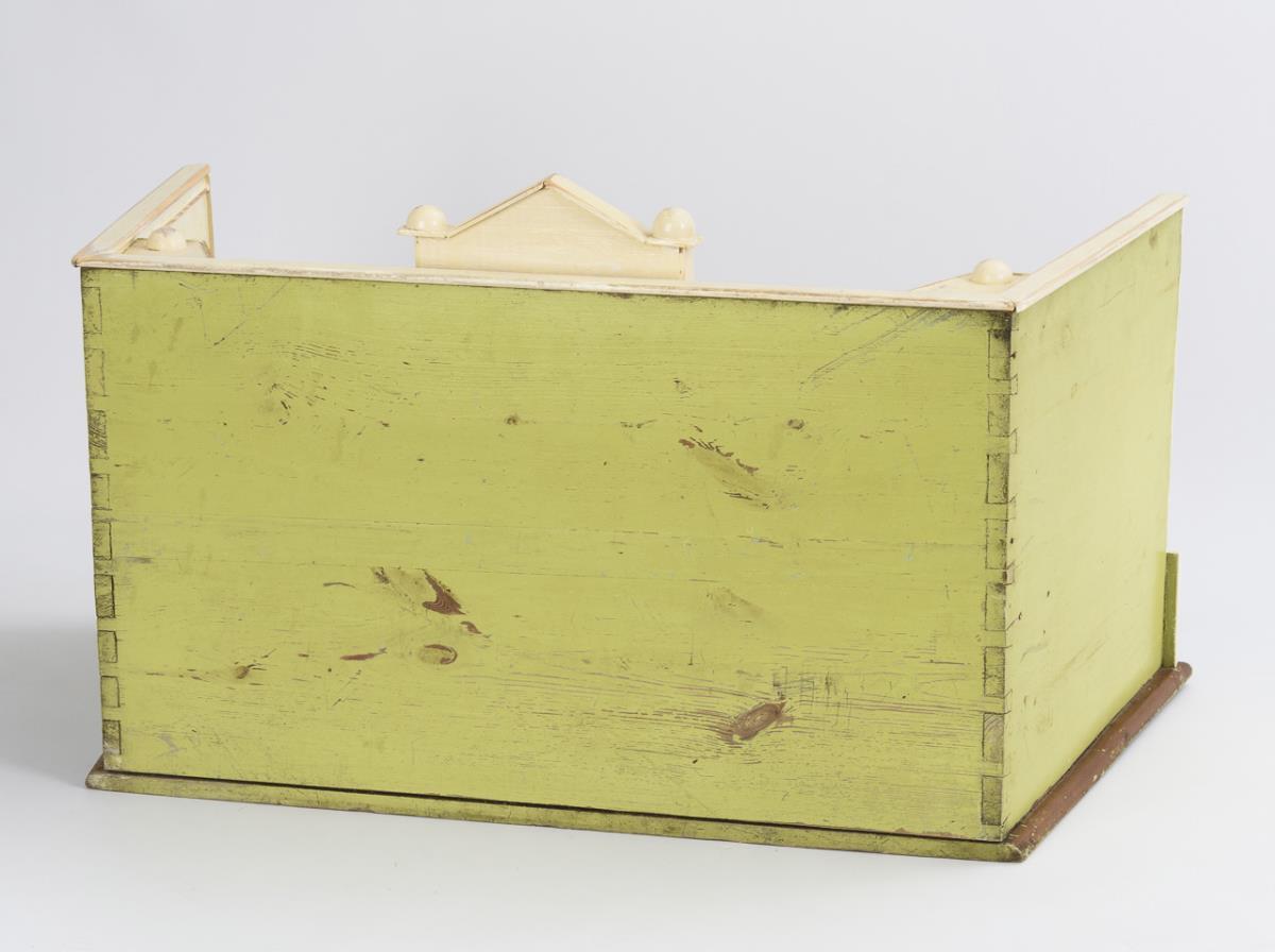 Holz, innen cremefarben und braun, außen grün gestrichen. 39 x 72,5 x 37 cm.