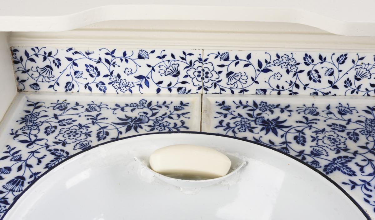 Mit blau-weißen Keramikfliesen und Emailleschüssel, dazu Handtuch mit gesticktem Holländermotiv. Schüssel mit Retuschen und nachträglich angebrachter Seifenschale.