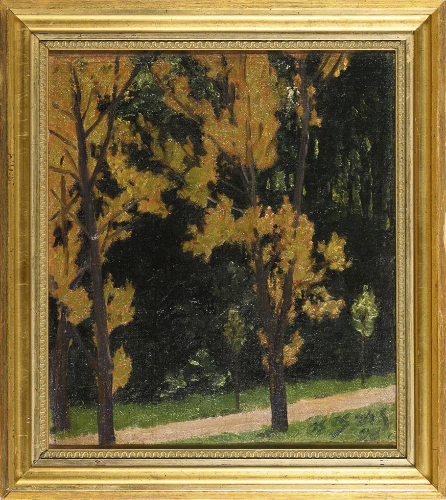 Von der Rasenallee bei Wilhelmshöhe aus dargestellte Bäume an einem schmalen Weg. Leinwand altdoubliert.