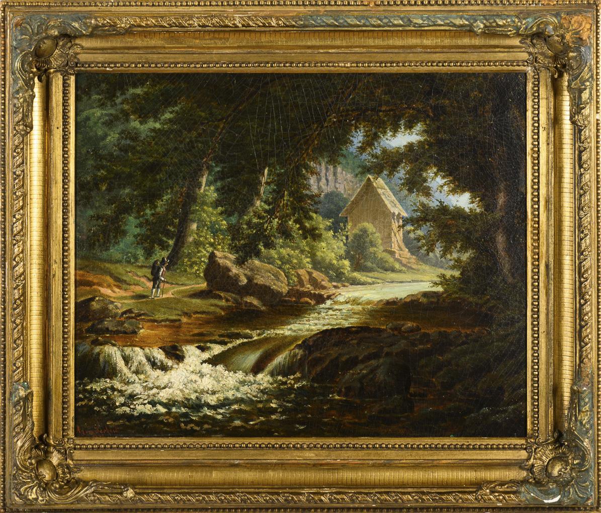 Wanderer auf einem Weg nahe einer Hütte am Fluss in stimmungsvoller Waldlandschaft. Leichte Altersspuren.