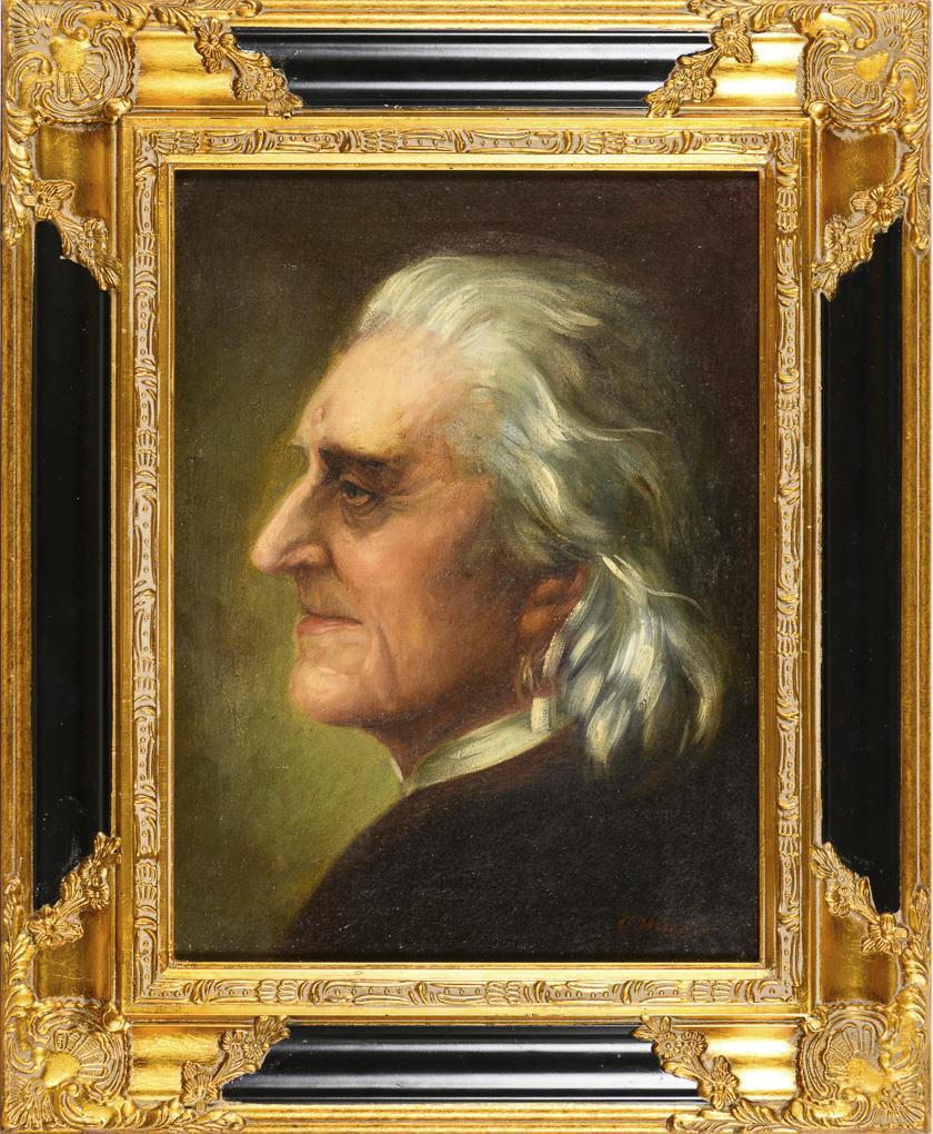 Profilbildnis des Komponisten mit langem weißen Haar vor neutralem Hintergrund. Leichte Altersspuren.