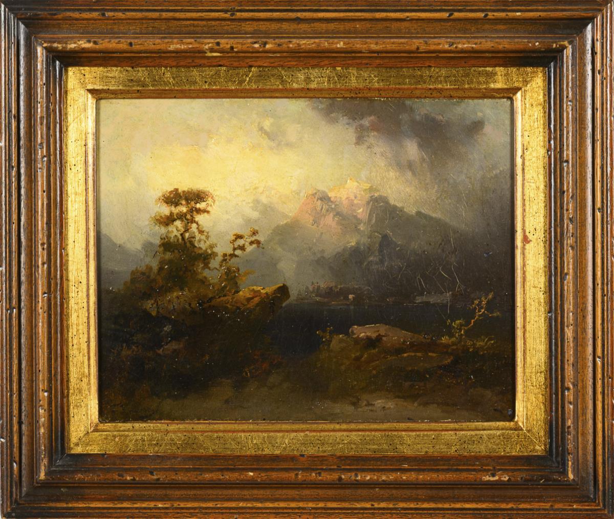Dunkle Wolken über dem Gebirge und dem See mit teils durchscheinender Sonne hinter den Wolken. Altersspuren.