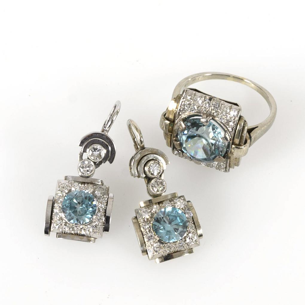 Ring mit krappengefasstem Farbstein, umgeben von 20 kleinen, eingelassenen Diamanten. Schmale Schiene. Ohrhängerpaar mit Farbsteinen, je 2 zargengefassten Brillanten und 12 Diamanten . Federbügel. Facettenkanten der Mittelsteine teils berieben.