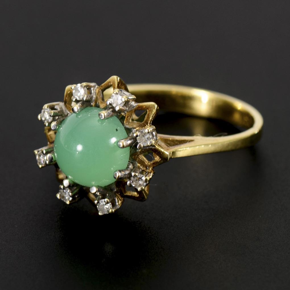 Krappengefasster Cabochon, umringt von 8 kleinen Diamanten. Schmale Schiene.