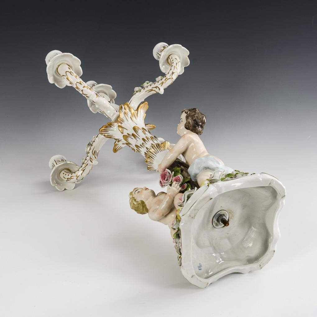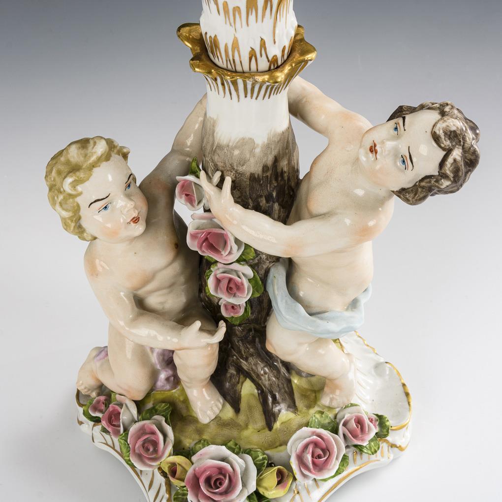 Fünfflammiger Leuchter mit zwei, den Baumstammschaft umfassenden Putten und Rosenbelag. Partiell Bestoßungen an den Blüten.