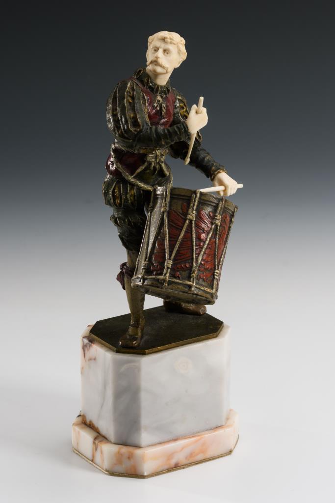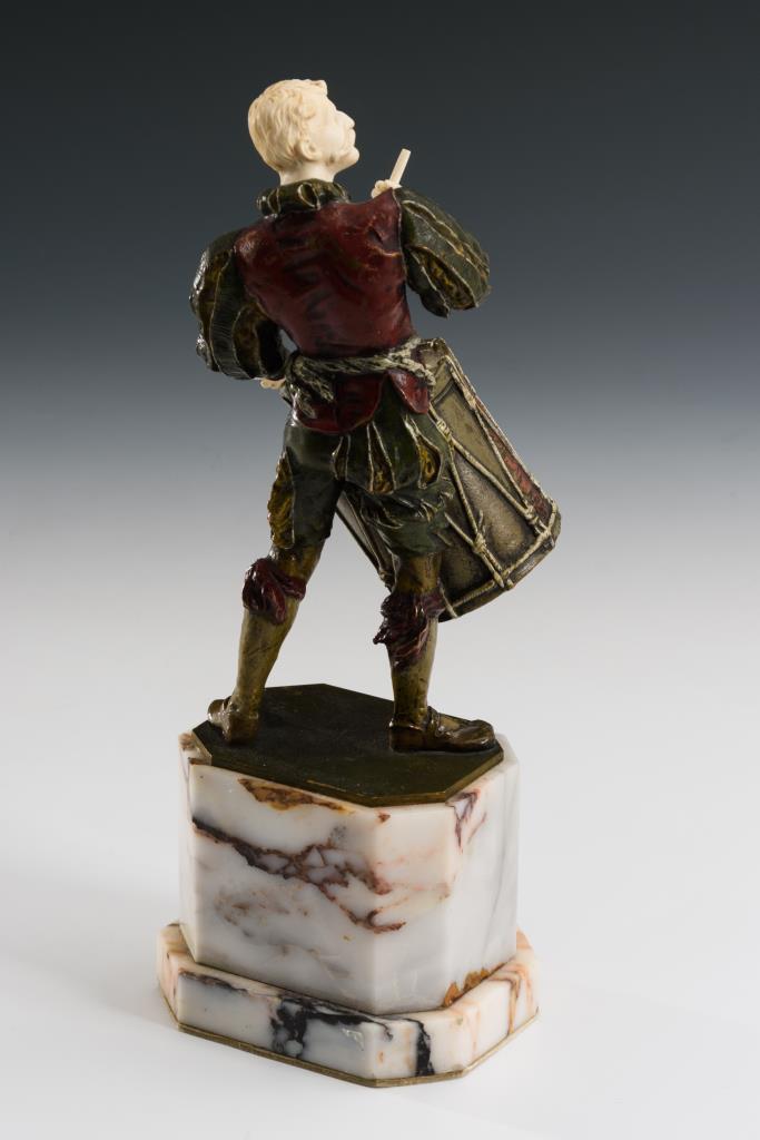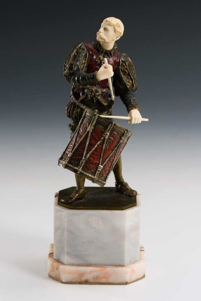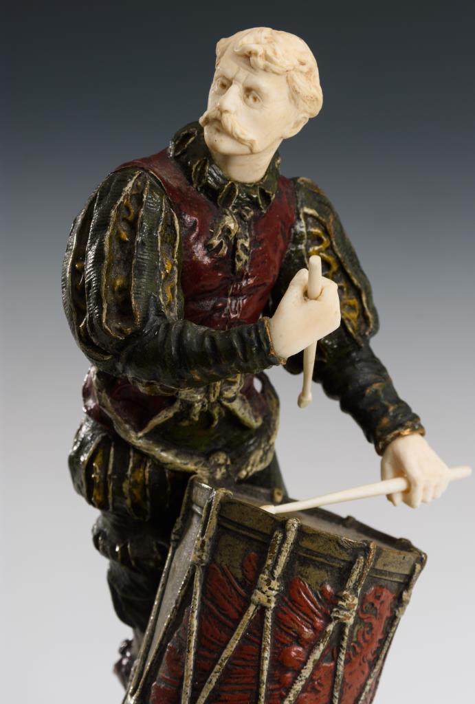 Detailliert gearbeiteter Mann mit Pauke; auf der Pauke ein rot gemalter Adler. Haarriss im Elfenbein (am Haar), einige wenige Alters-/Gebrauchsspuren.