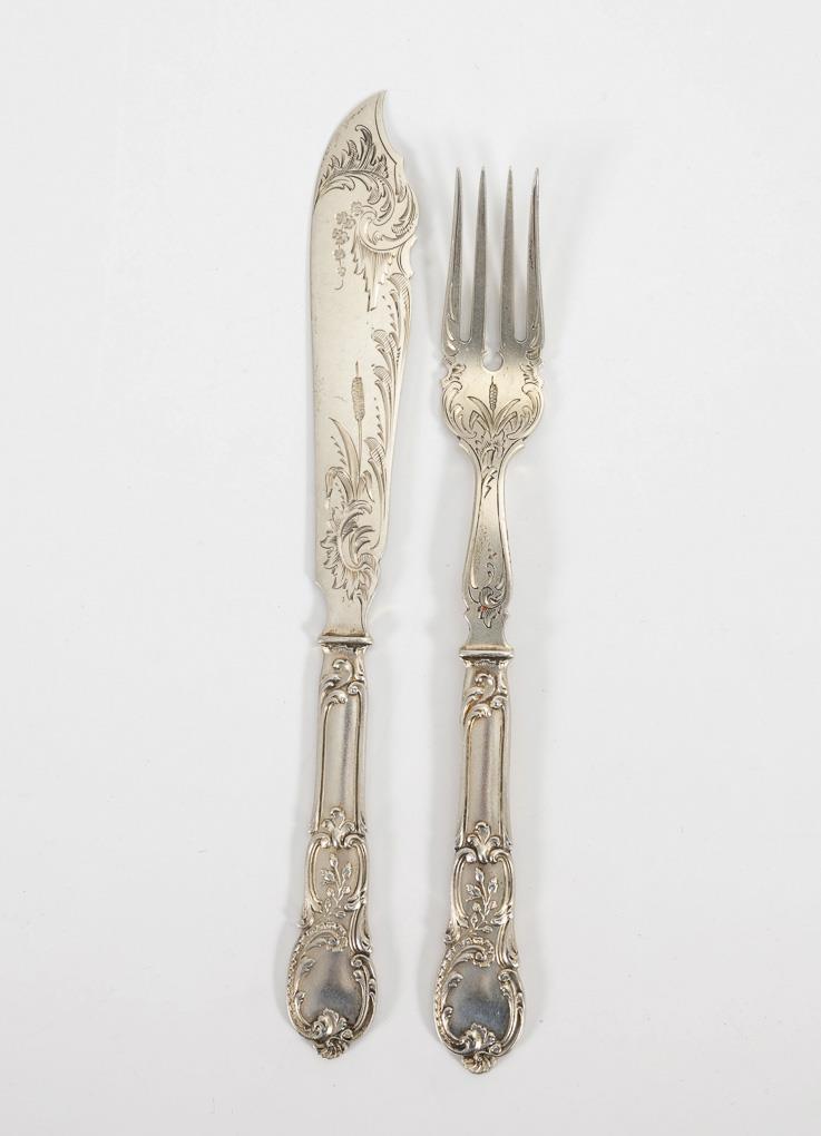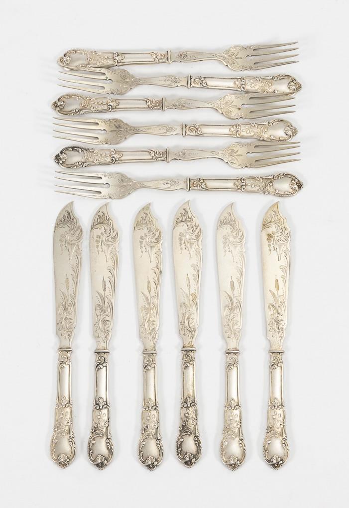 6 Messer und 6 Gabeln mit rocaillierten Griffen und floralen Gravuren. Leichte Altersspuren.