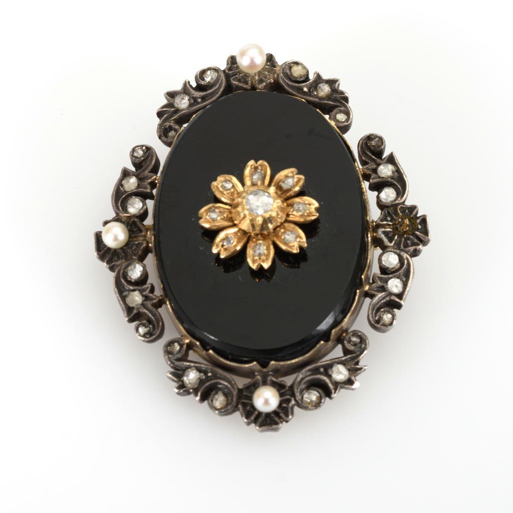 Onyxbrosche/Anhänger mit Altschliff-Diamanten und Perlchen