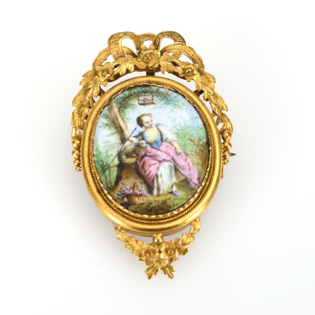 Email-Miniatur mit farbig gemaltem Motiv einer Schäferin unterm Baum. Zargenfassung mit Ranken- und Schleifenzier. Verglast gerahmte Rückseite. Hakenverschluss.