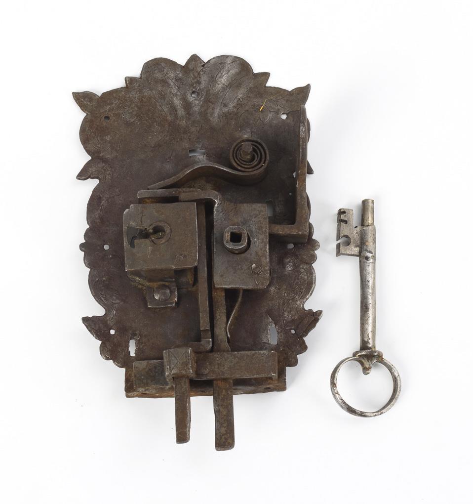 Geschweifter Schlossboden mit Einhaue, durch den Türdrücker oder die Drückernuss bewegte Hebefalle; die Schrägfalle wird durch den Schlüssel oder Nachtriegel bedient. Teils vorhandenes Eingericht. Schloss repariert, Lötspuren am Schlüssel, Alters-/Gebrauchsspuren.