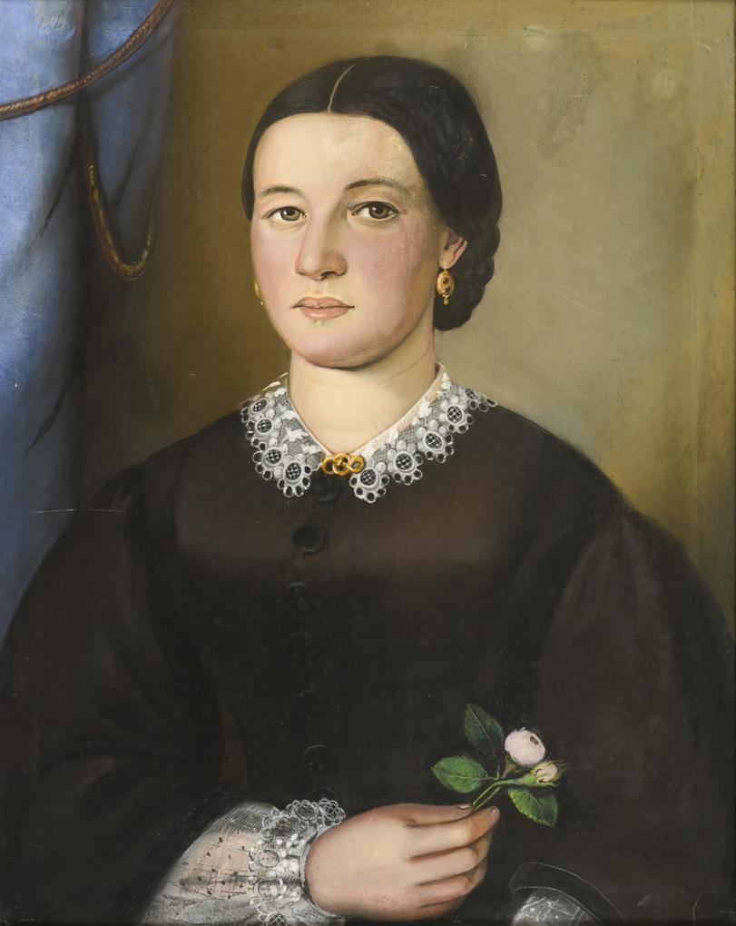 Porträt einer jungen Frau aus der Familie Klinghammer aus Rudolstadt mit dunklem Kleid und junger Rose in der Hand. Kleine Risse an den Rändern.