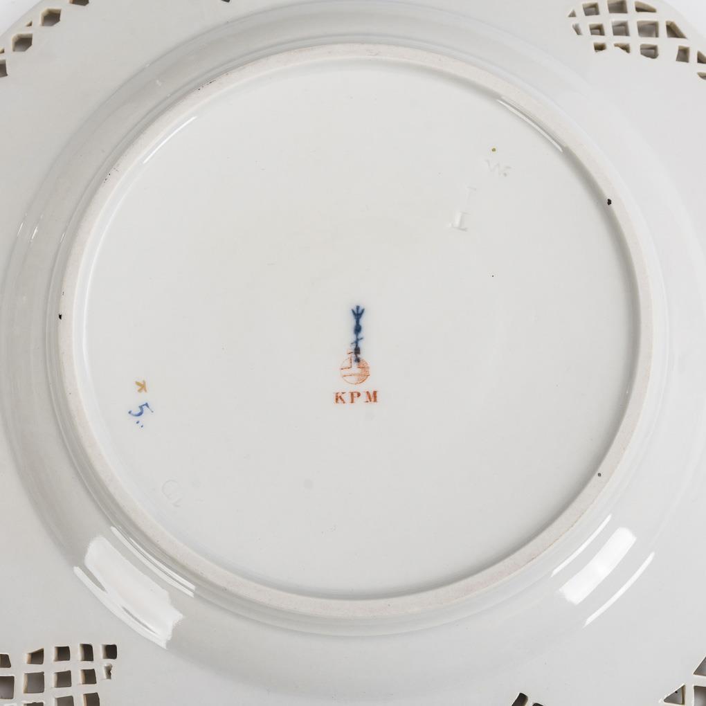 Modell "Neuzierat". Passige Teller mit Gitterdurchbrüchen am Rand sowie reliefierten Spalieren mit Blättern und Rocaillen in den Zwickeln. Mit je drei fein gemalten Blumenbuketts.