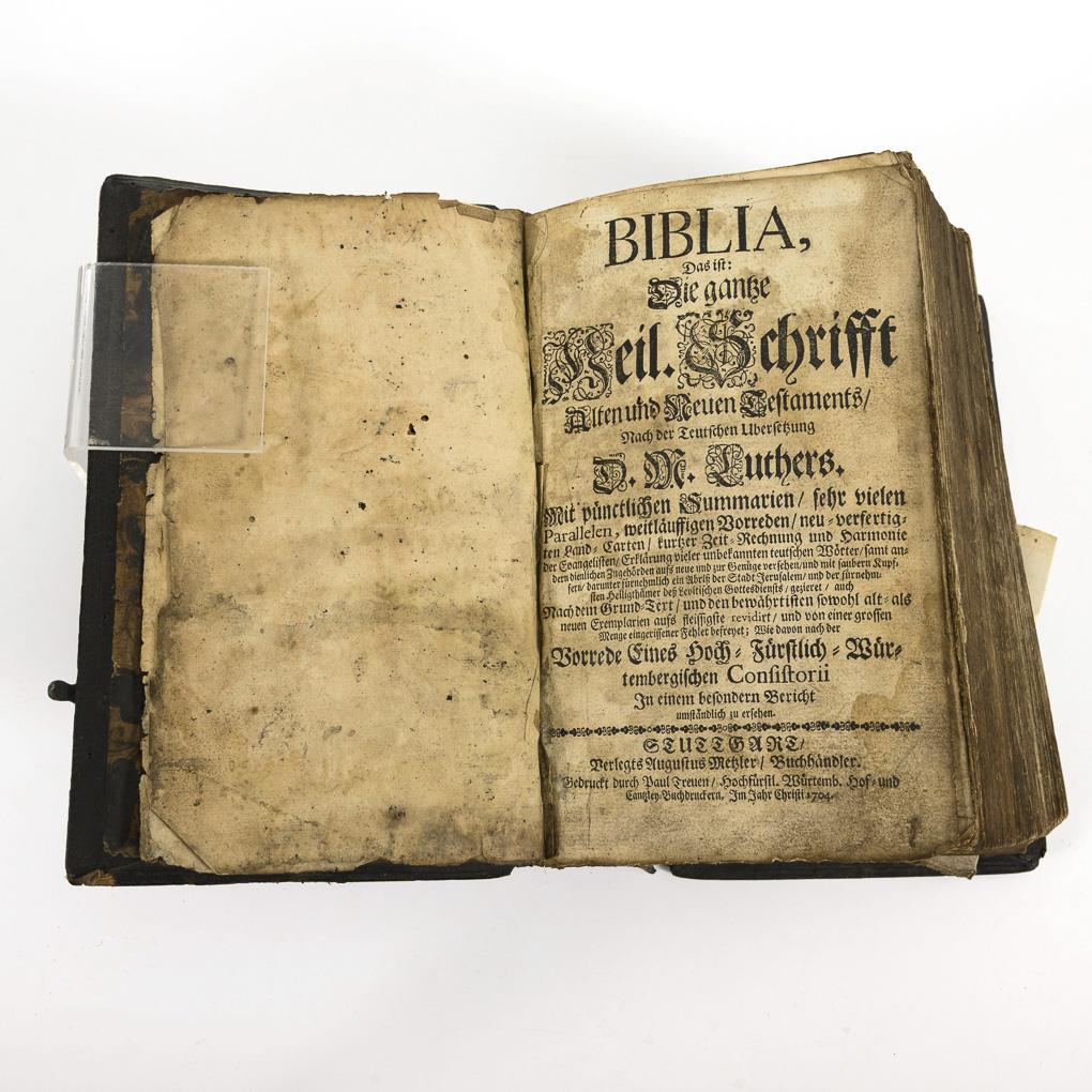 Titelkupfer, Titel, handschriftliche Seite, (54) Seiten mit drei Porträtkupferstichen von Adligen, 640, Kupferstich, (16), 280, 210, Kupferstich, (16), 356 und sehr umfangreiches Register von mehreren hundert unnummerierten Seiten. Weiterhin Holzschnittvignetten und einige kleinere Kupferstiche, sowie lose Landkarte (defekt in zwei Teilen). Ledereinband. Schließen und Vorsatz fehlt, starke Nutzungsspuren aber fester Block, Ledereinband alt repariert.