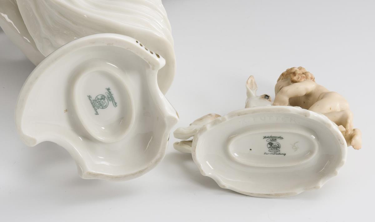1x Entwurf Carl Werner (1895-1980), bezeichnet: junges Paar in Tanzpose. / 1x Entwurf Karl Tutter (1883-1969), bezeichnet: vor einem Rehkitz kniender Putto mit Blüten. 2 Finger am Tanzpaar restauriert.