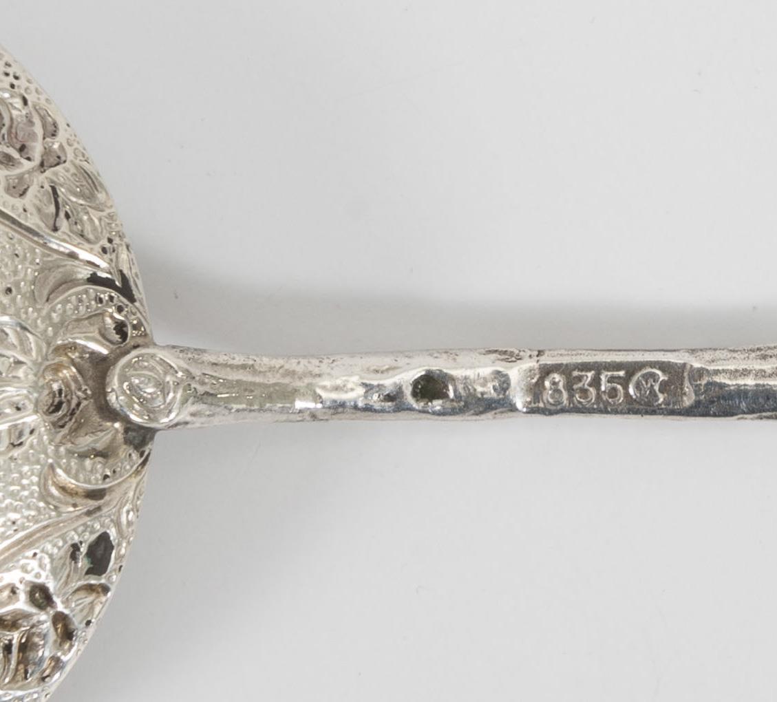 12 Löffelchen mit Rocaillengriff (L 10 cm) und 5 Vorlegeteile mit Hildesheimer Rose (L 10 - 14 cm).