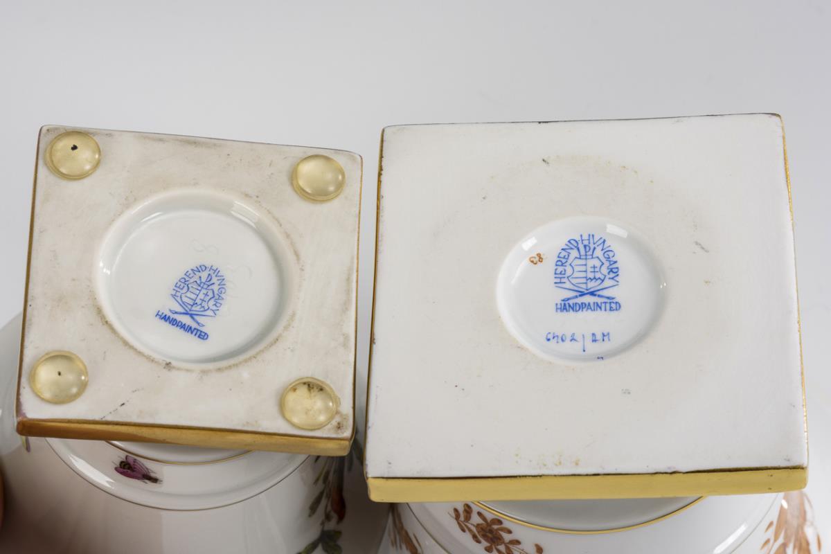 Kratervasen mit vier Tatzenfüßen, auf Quadratplinthe. 1x mit indianischer Blumenmalerei in Braun, 1x mit Rothschildekor.