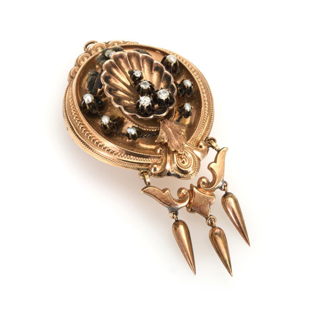 Historismus Anhänger/Brosche mit Altschliff-Brillanten und Halbperlchen