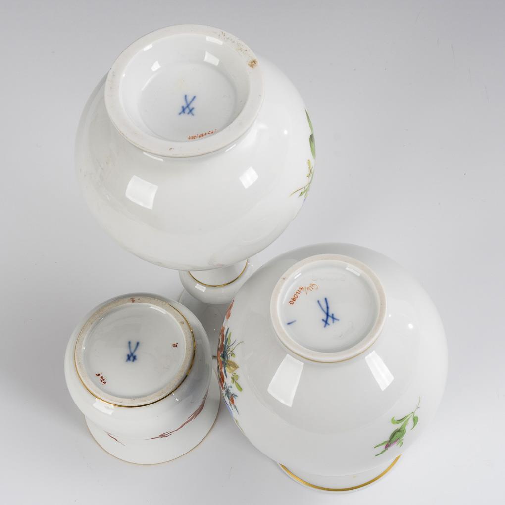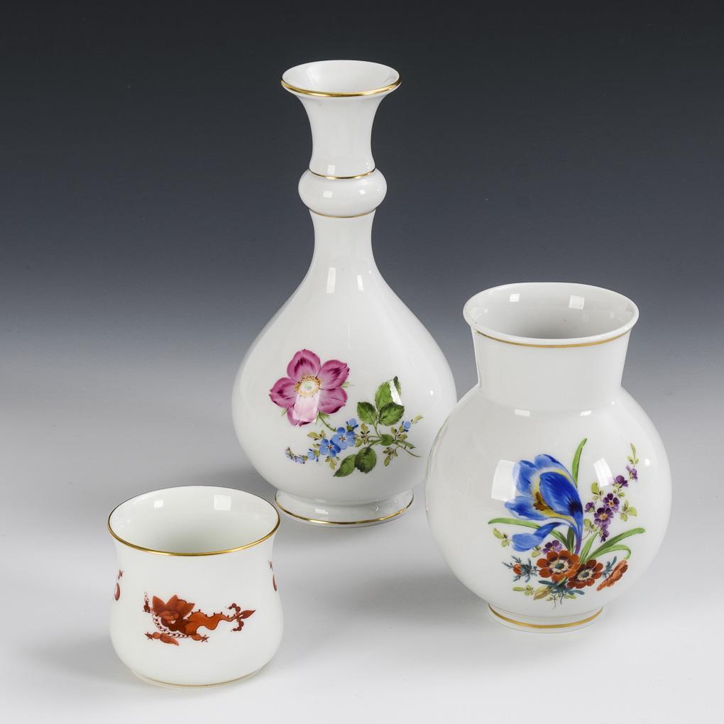 Polychrom bemalt, goldstaffiert. H Vasen 5,5, 12,5 und 18,5 cm.