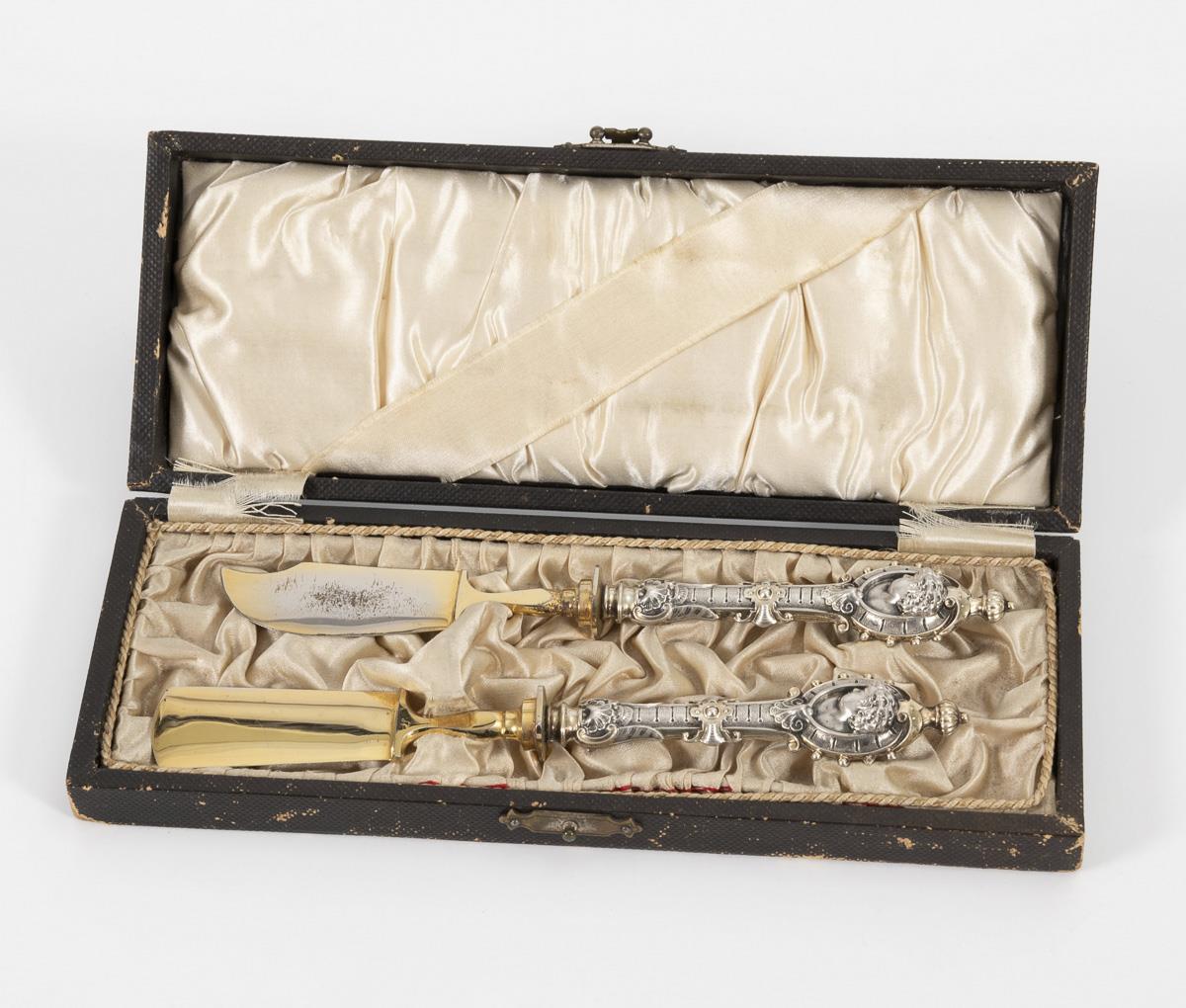 Silbernes Buttermesser und Käsemesser in Etui.