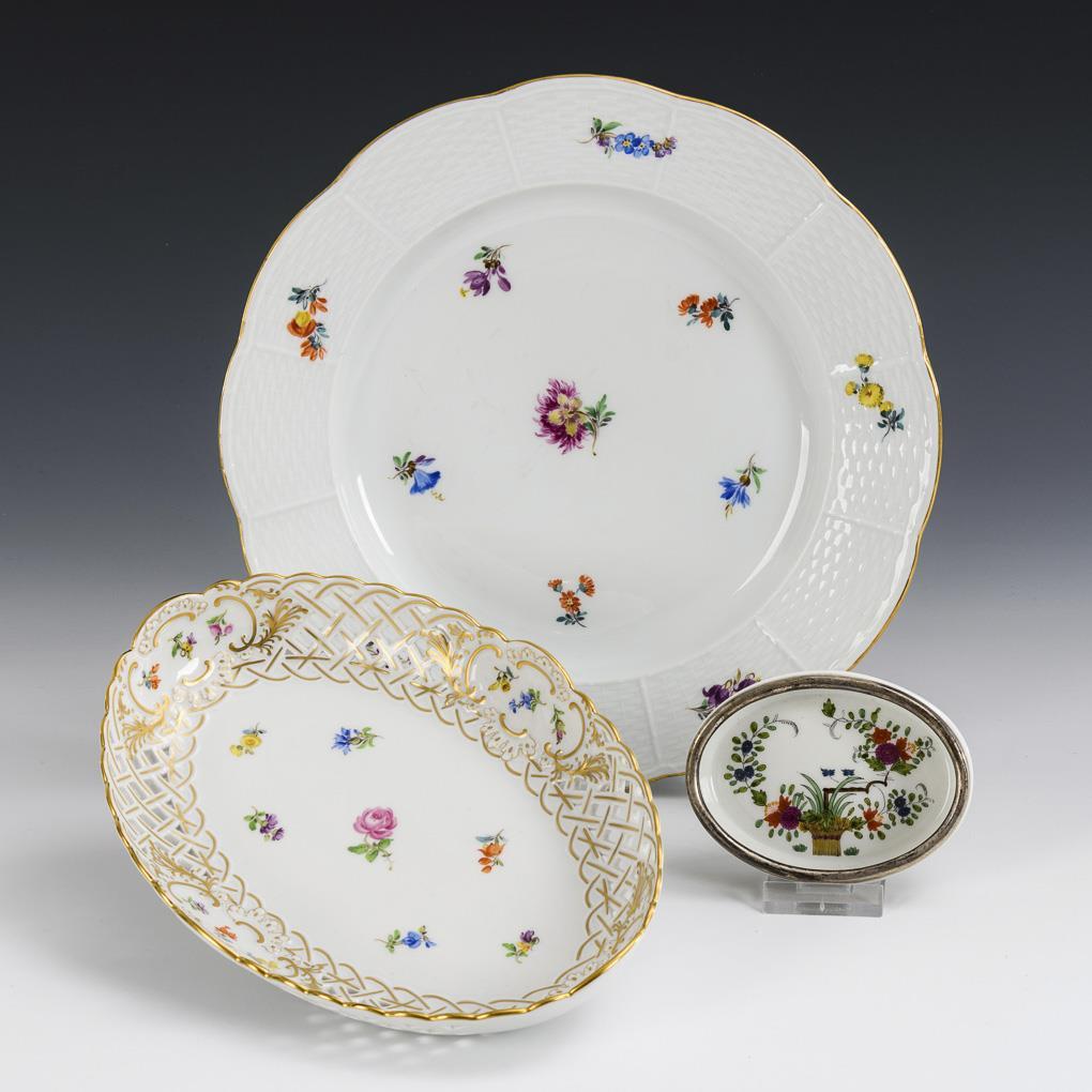 Teller, Durchbruchschale und Ascher mit Silbermontierung. Meissen.