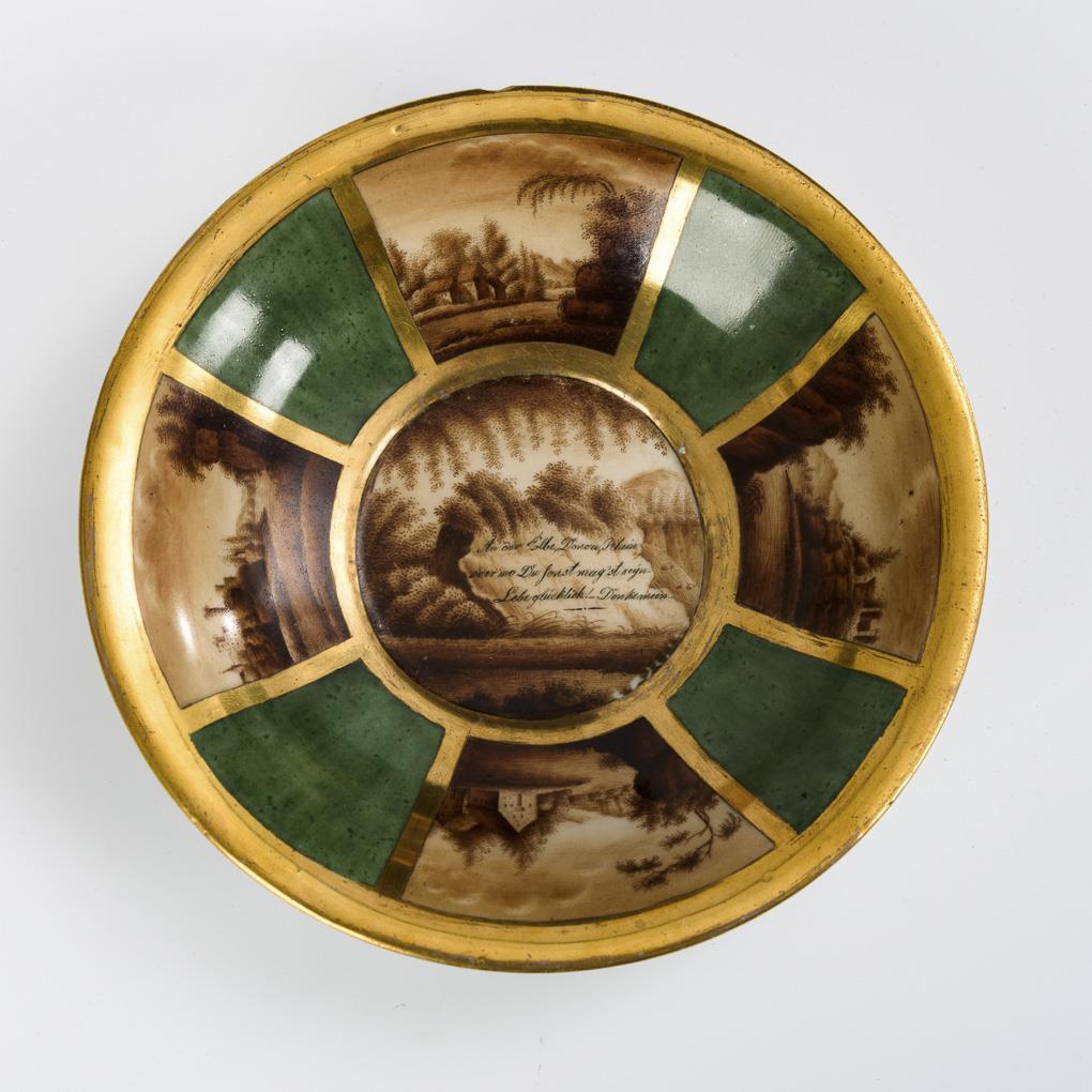 Gefußte Glockentasse mit Tierkopfhenkel. Grüner Teilfond, in goldgerahmten Rechteckkartuschen braungemalten Landschaften, innen vergoldet. Im Spiegel der Untertasse die Widmung "An der Elbe, Donau, Rhein, oder wo Du sonst magst seyn - Lebe glücklich! - Denke mein. -". Minimaler Abrieb im Untertassenspiegel.