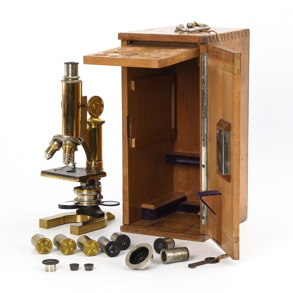 Im originalen Kasten Mikroskop mit Revolver-Objektiv, Lamellenblende im Kondensor und doppelseitigem Spiegel. Im Kasten Schub mit 4 gemarkten Messing-Okularbüchsen, 3 gemarkten Okularen sowie weiteres ungemarktes Zubehör. Dazu Stoffetui mit 4 gemarkten Objektiven (1 Kunststoff- und 3 Messingbüchsen). Dazu 1 ungemarktes Objektiv und 8 weitere Okulare (ungemarkt oder anderer Hersteller). Teils Alters-/Gebrauchsspuren.