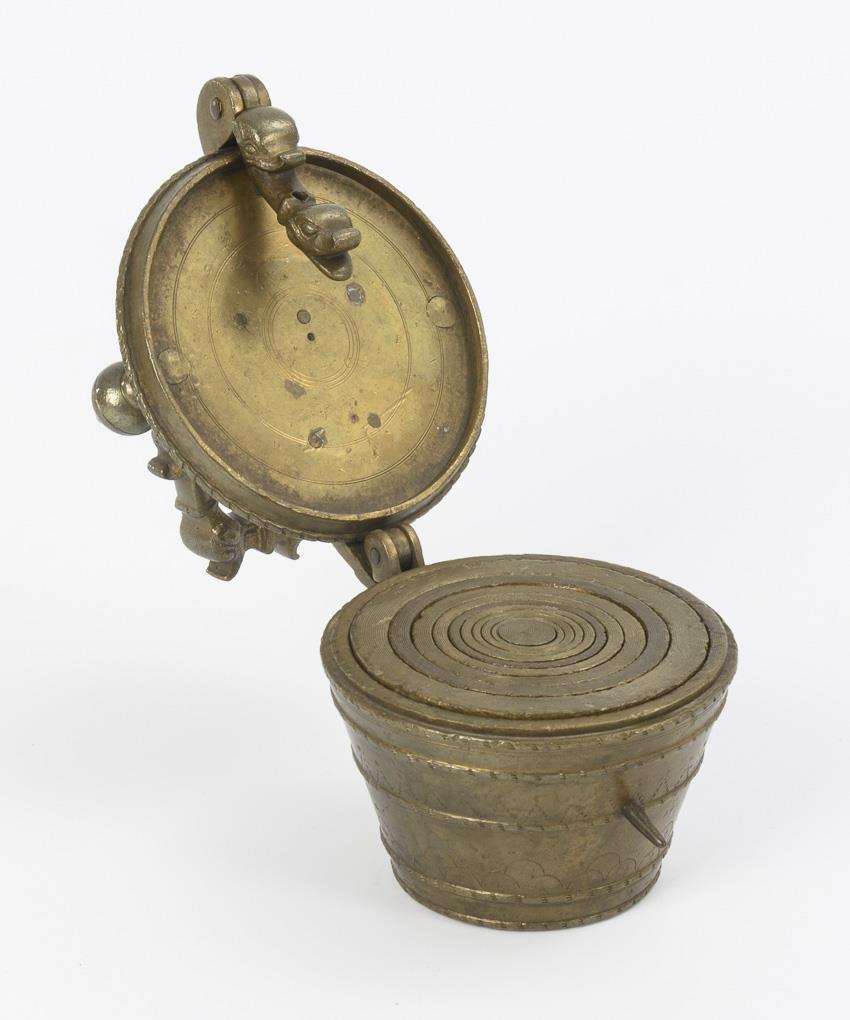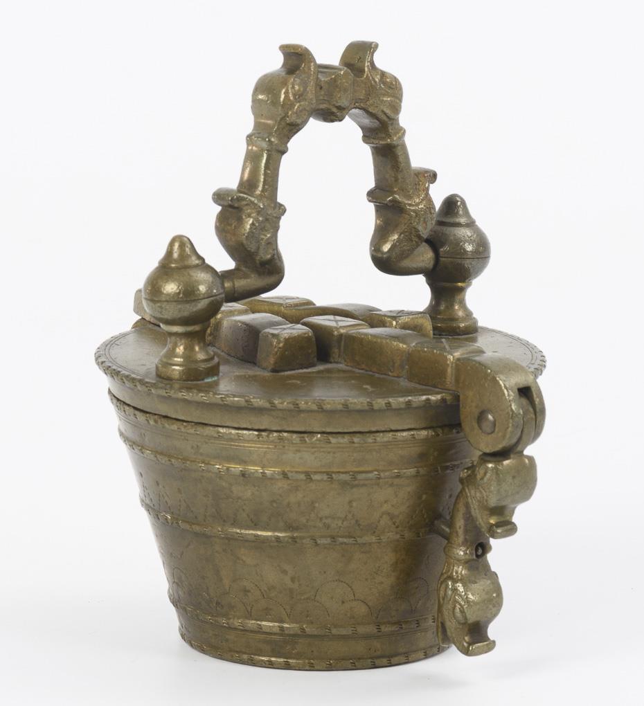 Bronze. H ohne Henkel 10 cm, Ø Haus 10 cm. 2,9 kg.