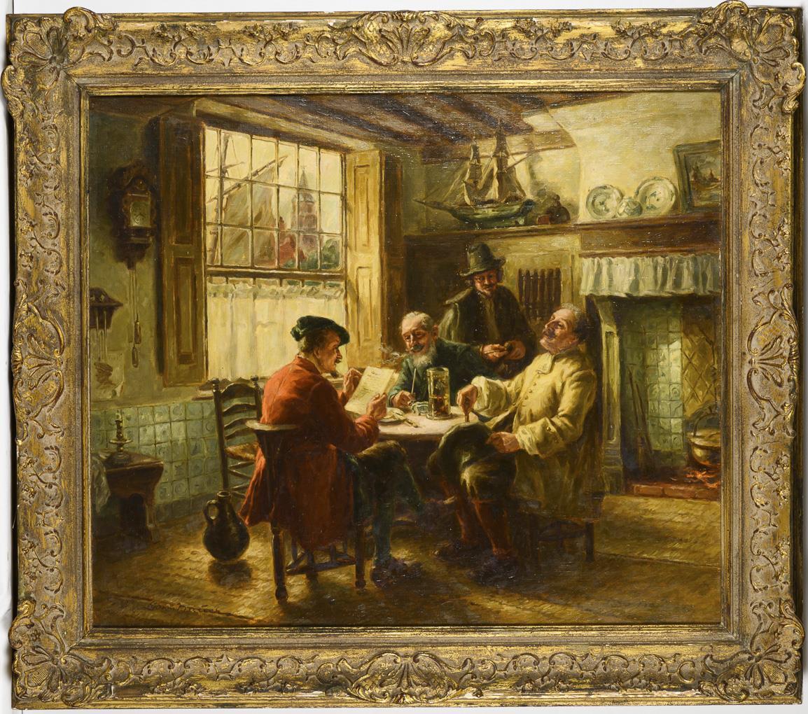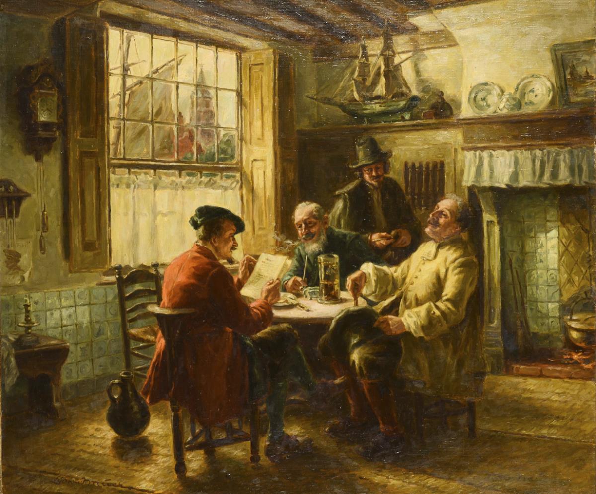 Vier Männer in der Kleidung des 17. Jahrhunderts im Gespräch über einem Brief an einem Tisch in der Stube. Leichte Altersspuren.