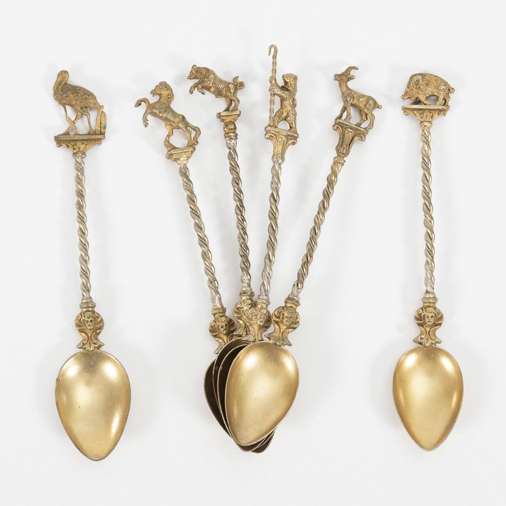 Historistische Löffel mit gedrehten Stielen und verschiedenen Tierplastiken am Griffende, alt vergoldet. Leichte Alters- und Gebrauchsspuren, an den Stielen goldberieben.