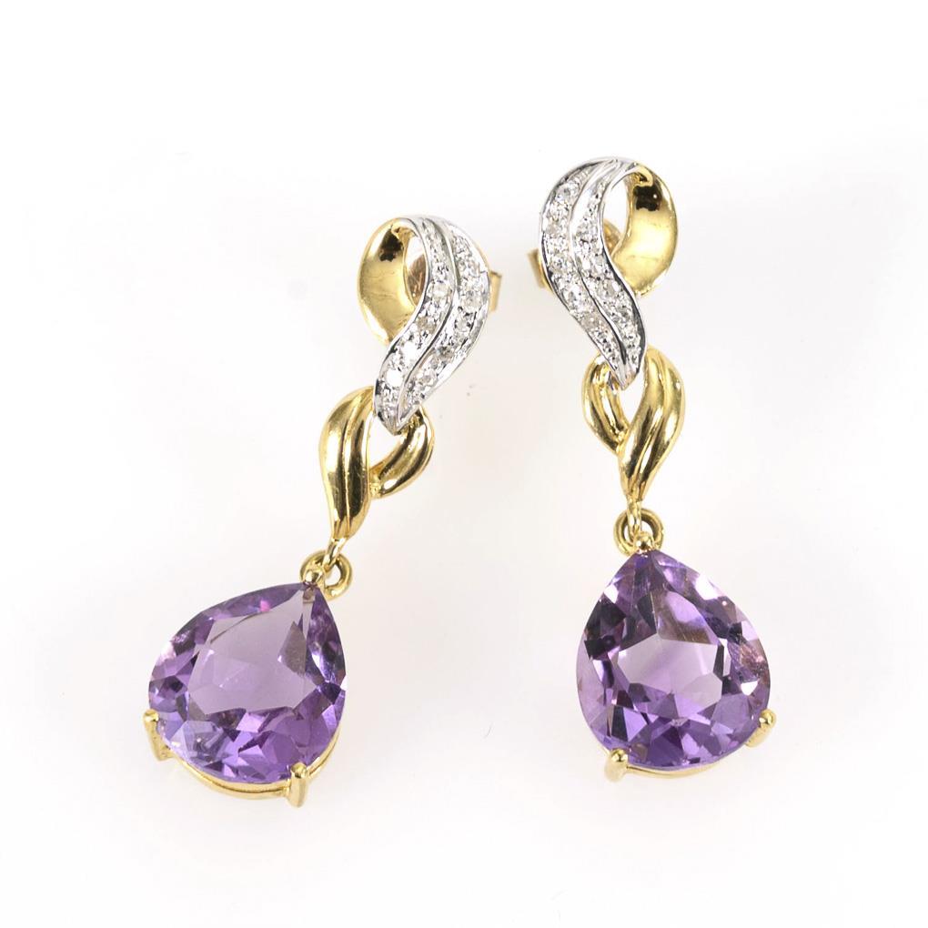 An Schlaufenbrisur mit je 9 kleinen, eingelassenen Diamanten, abgehängter Amethyst. Steckmechanik.