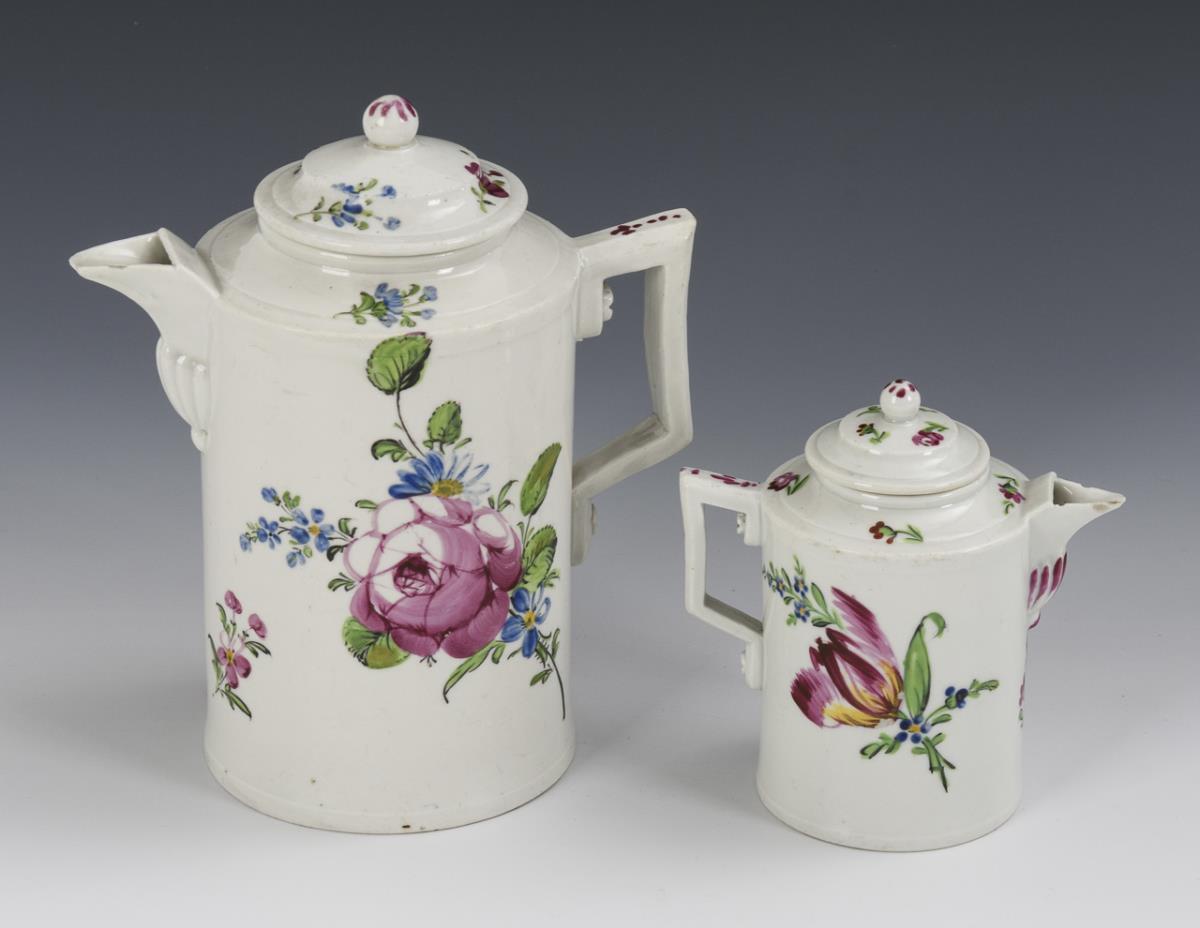 Zylinderkannen mit gewinkeltem Henkel und Kugelknaufdeckel. Beide mir Haarrissspinne im Boden, Schneppen bestoßen, 1x Haarriss am Mündungsrand.
