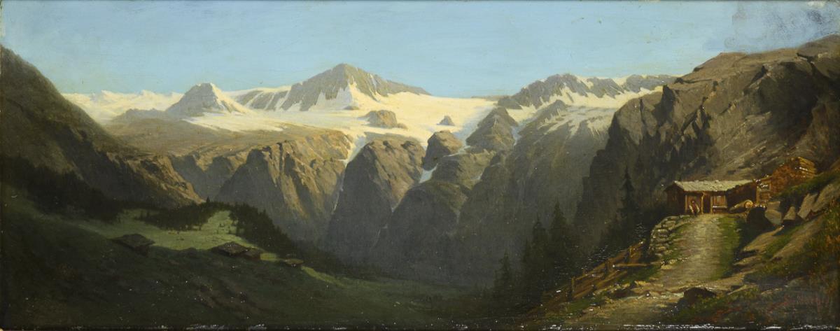 Hütte mit großem Holzstapel und Blick hinab ins Tal vor den verschneiten Gipfeln.