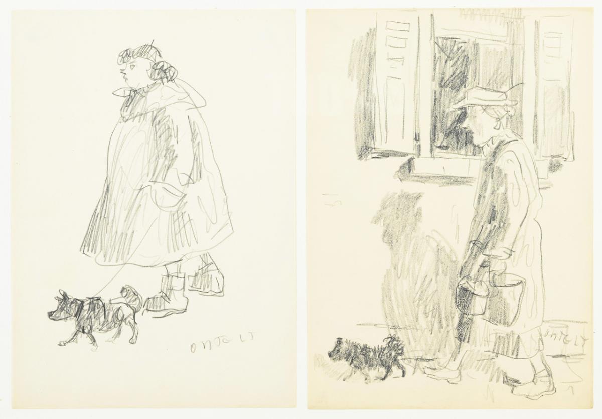 2 Zeichnungen mit Damen, die jeweils ihren Hund Gassi führen. Blatt je minimal griffspurig.