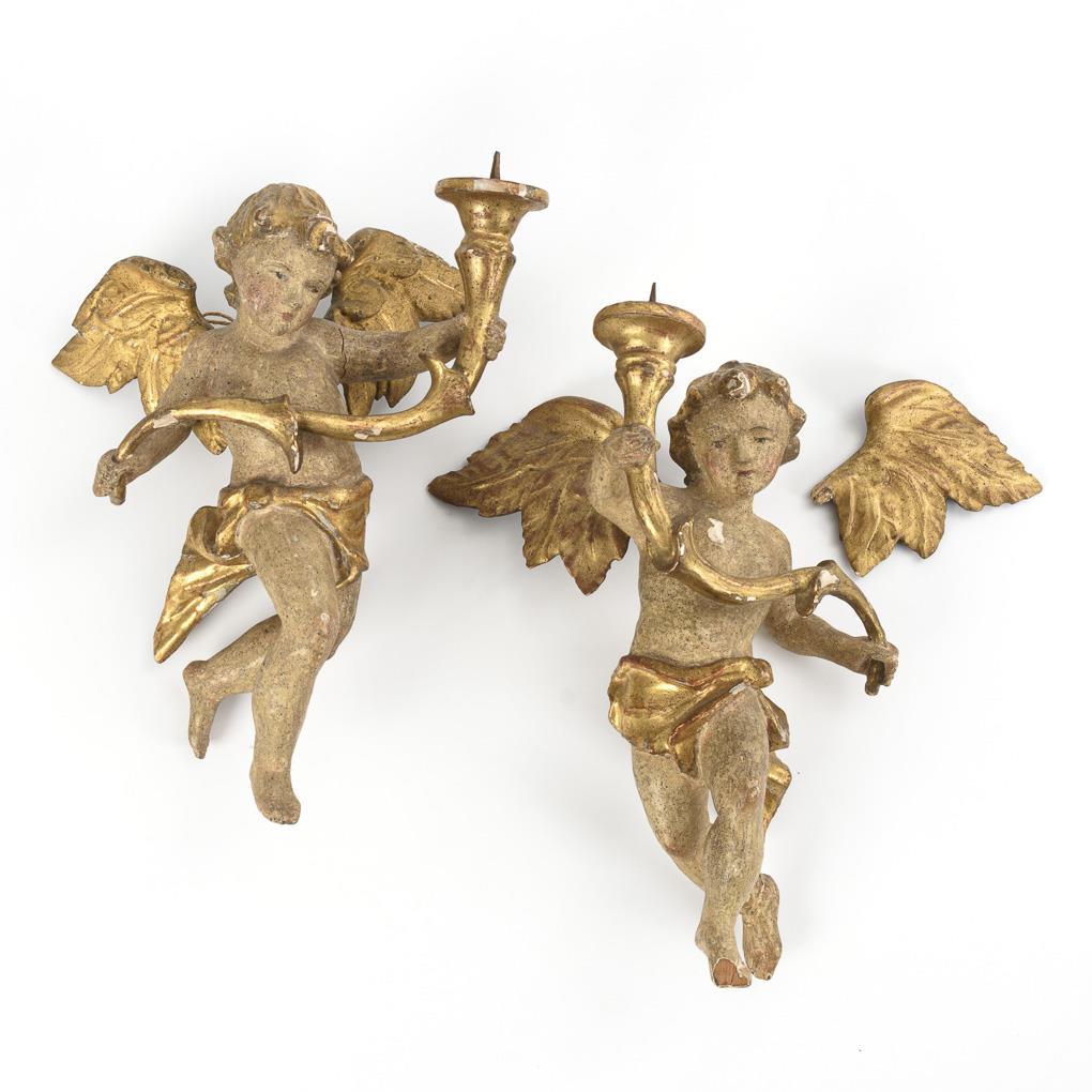 Spiegelbildlich gearbeitete Gegenstücke der schwebenden Engel, die volutenförmige Kerzenhalter tragen. Wenige Fehlteile und Klebestellen, 1 Flügel abgebrochen, Fassung übergangen, Alters-/Gebrauchsspuren.