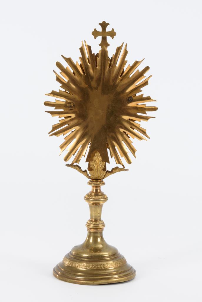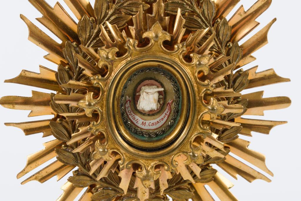 Ähnlich einer Strahlenmonstranz gestaltetes Reliquiar mit verglaster Theca. Auf der Cedula "S. Optati M. Caesaraugust". Fuß wohl ergänzt.