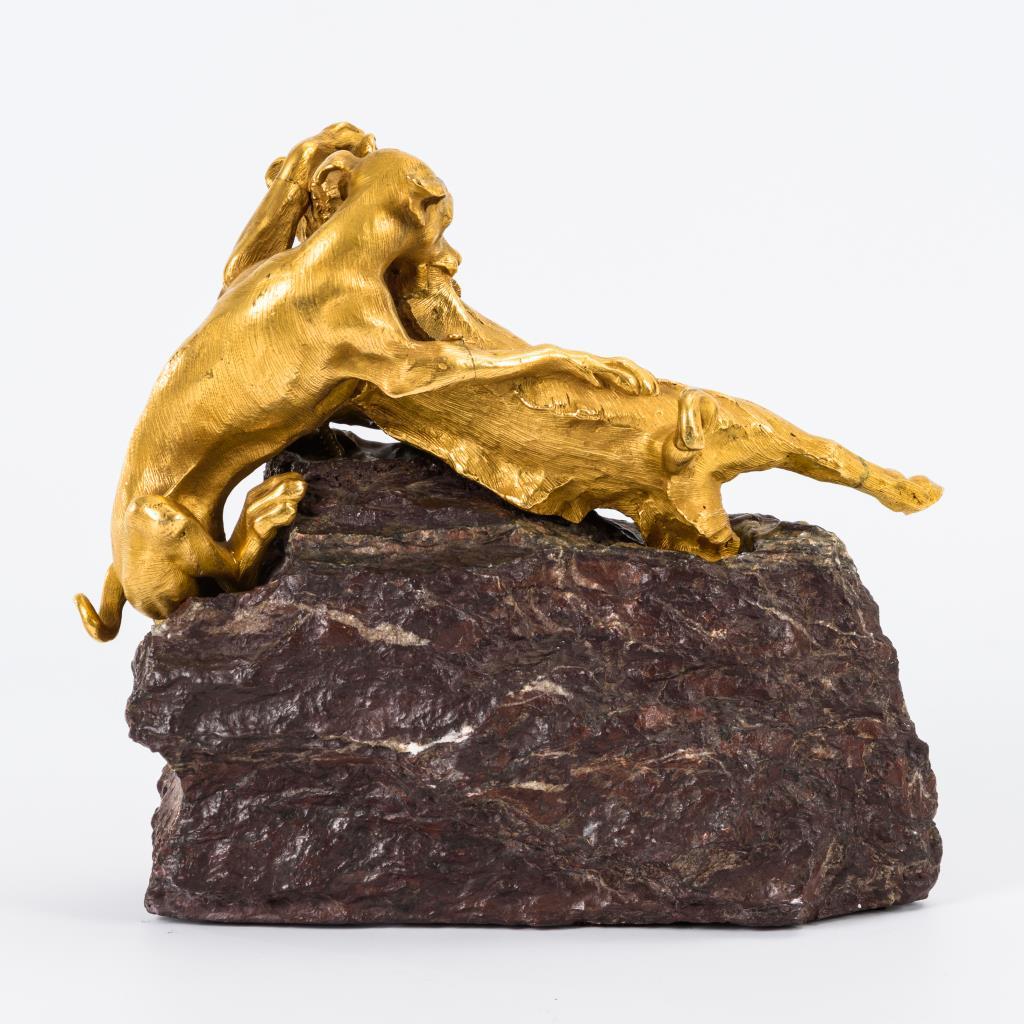 Bronze mit feiner Ziselierung vergoldet, naturalistischer Felssockel aus Bodenseequarz.Wohl um bzw. vor 1800.Gesamt 25 x 28 x 14 cm.