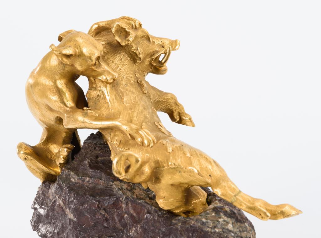 Dramatischer Kampf zwischen dem Hatzhund und gestelltem Keiler. Haarrisse an 3 Gussnähten, 1 angebrochene Stelle repariert.
