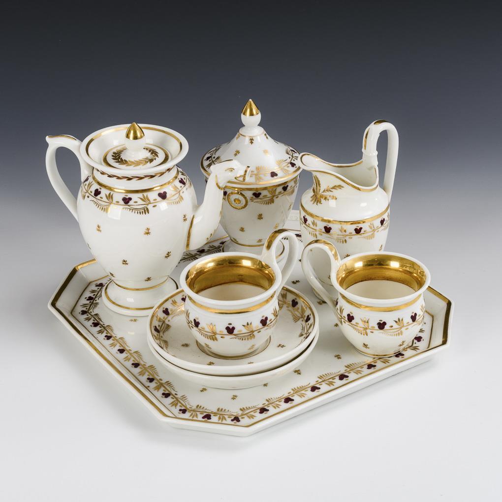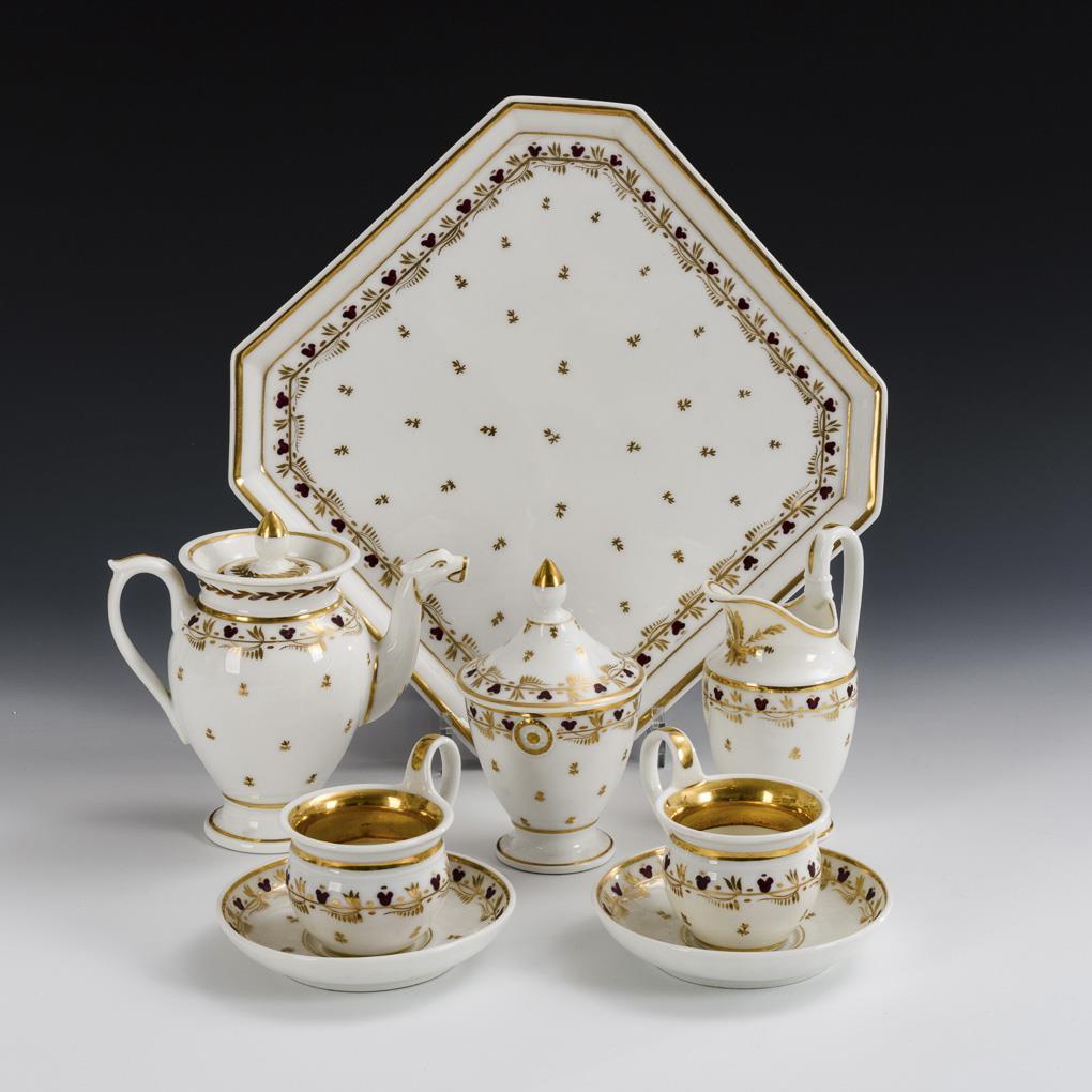 8 Teile. Mit gold-bordeauxfarbener, stilisierter Floralmalerei. Kaffeekanne (H 16 c), Milchkännchen (H 15 cm), Zuckerdose (H 14,5 cm), 2 Tassen, 2 Untertassen und quadratisches Tablett (27,5 x 27,5 cm). Kleiner Chip am Innenrand des Kannendeckels, kleiner Brandriss am Rand des Milchkännchens.