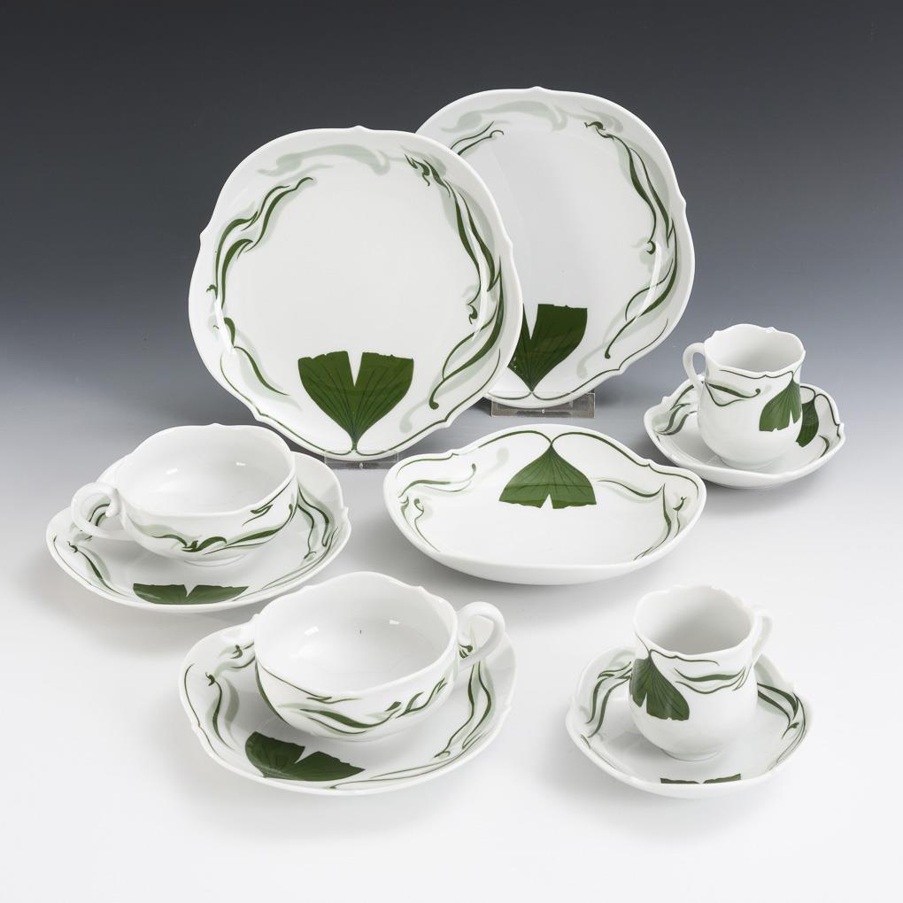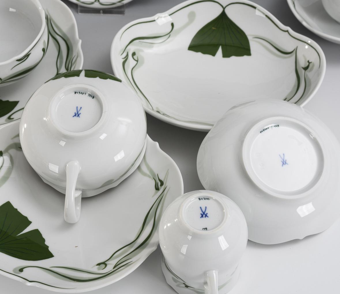 2 Teegedecke, 2 Mokkatassen und 1 Schale mit Ginkgoblattdekor. Meissen.