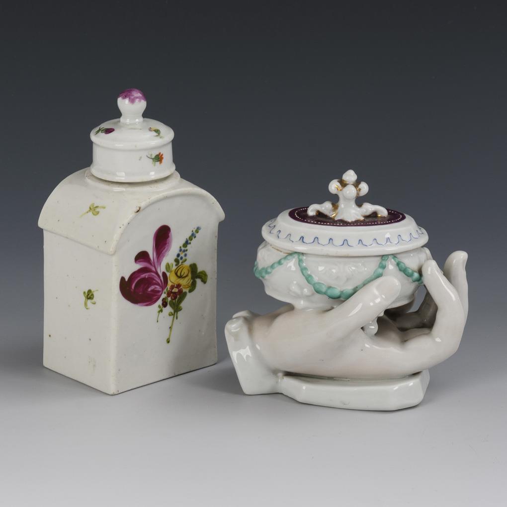 1x ungemarkt, Thüringen, Ende 18. Jh.: rechteckige Teedose mit Knaufdeckel und Blumenmalerei, schauseitig das Monogramm "JHB" (H 13,5 cm). / 1x ungemarkt, Conta & Böhme, 2. H. 19. Jh.: kleine, in einer Hand gehaltene Dose (H 10,5 cm). Bestoßung an der Schulter der Teedose.