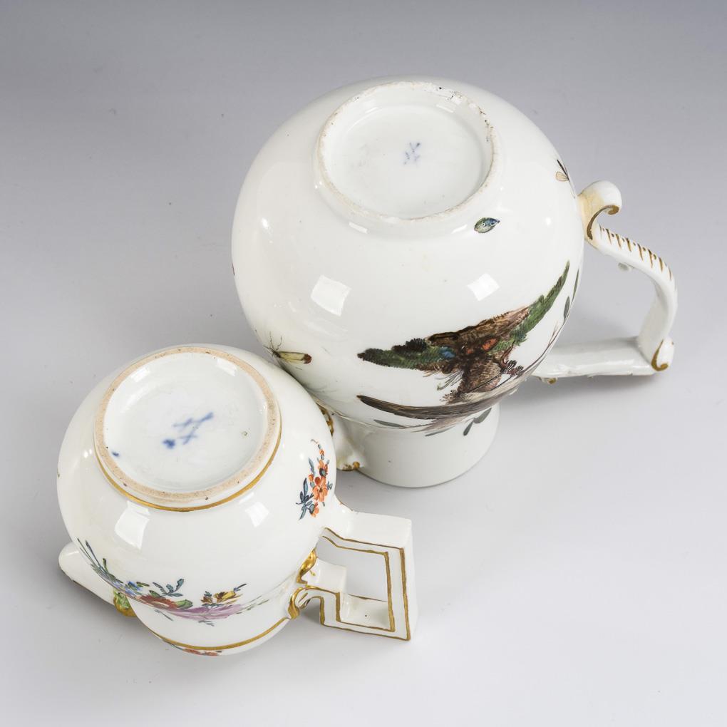 1x Schwertermarke, um 1750: Birnkännchen mit Rocaillehenkel, -schneppe und ergänztem Rosenknaufdeckel; beidseitig die Darstellung eines Vogels (u.a. Buntspecht). / 1x Schwertermarke mit Stern, Marcolini-Zeit, 1774-1814: Birnkännchen mit gewinkeltem Henkel, einem Lorbeerkranz an der Schneppe und Blütenknaufdeckel. 1x Henkel und Schneppe restauriert. / 1x Deckel restauriert und Bestoßung an der Schneppe.