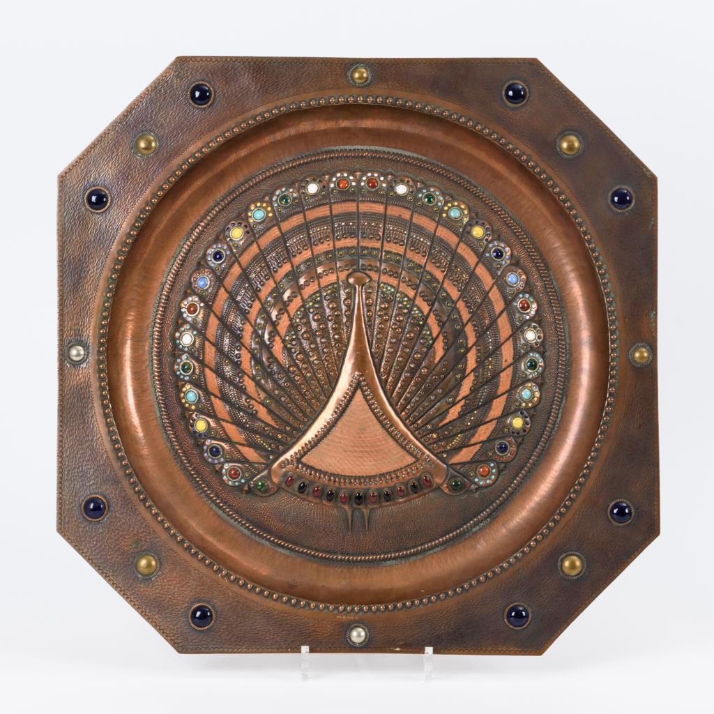 Kupfer getrieben und punziert, teils emailliert, Cabochons mit buntem Glassteinen.50 x 50 cm.