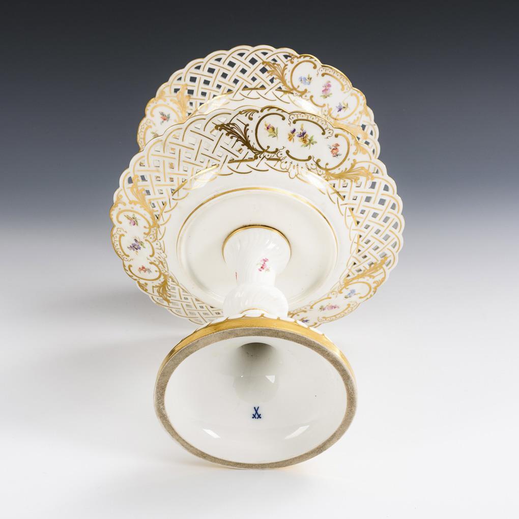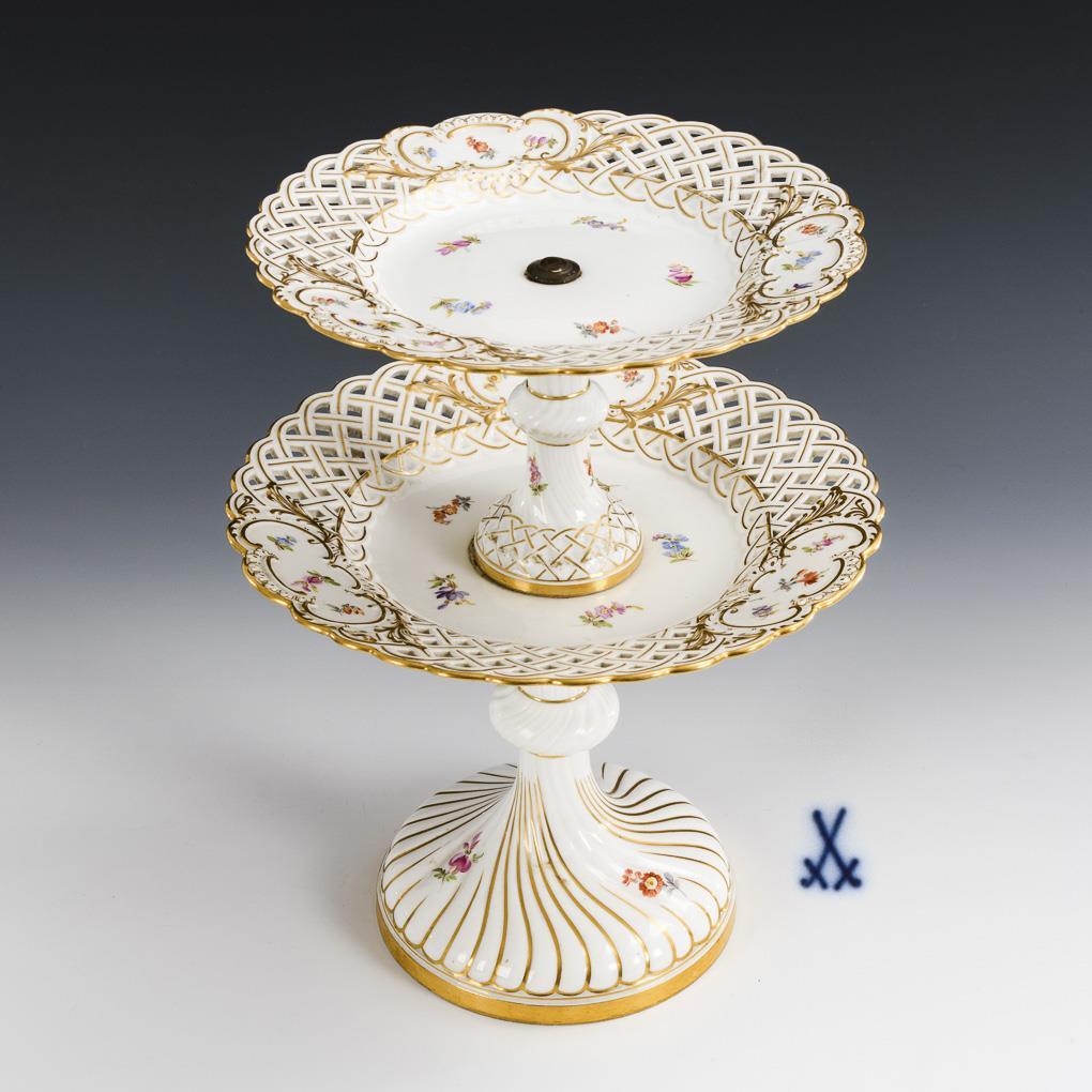 Form "Neuer Ausschnitt". Etagere mit zwei Durchbruchtellern, nodierten und gedrehten Schäften sowie Rundfuß. 1 Teller mit geklebtem Ausbruch an der Fahne.