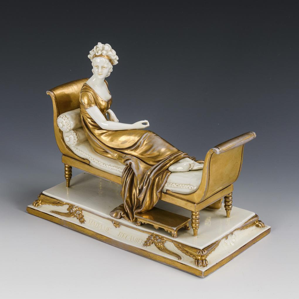 Auf einer Récamiere lagernde Dame, nach einem Gemälde von Jacques-Louis David (1748-1825). Partieller Goldabrieb, 1 Finger, 1 Sockelecke und 1 Ecke einer Lehne bestoßen.