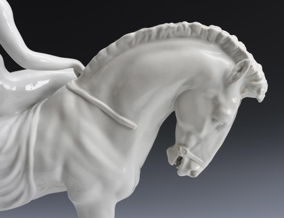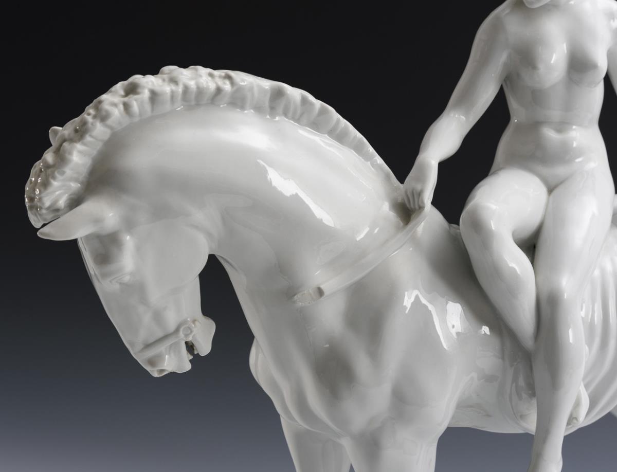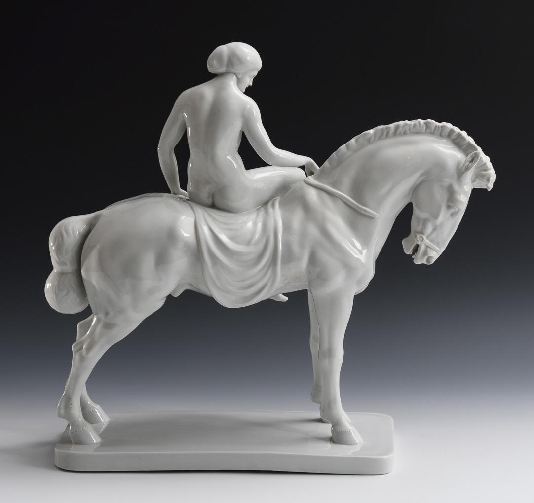 Große Plastik der nackt auf einem Pferd reitenden, legendären englischen Herzogin Lady Godiva, am Sockel bezeichnet. Zügel defekt.