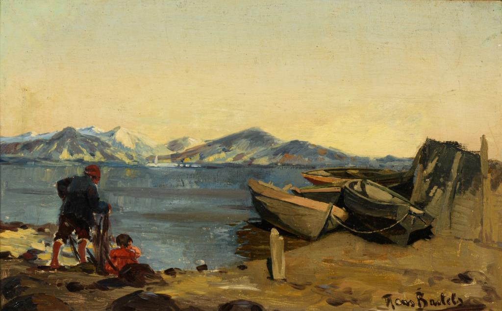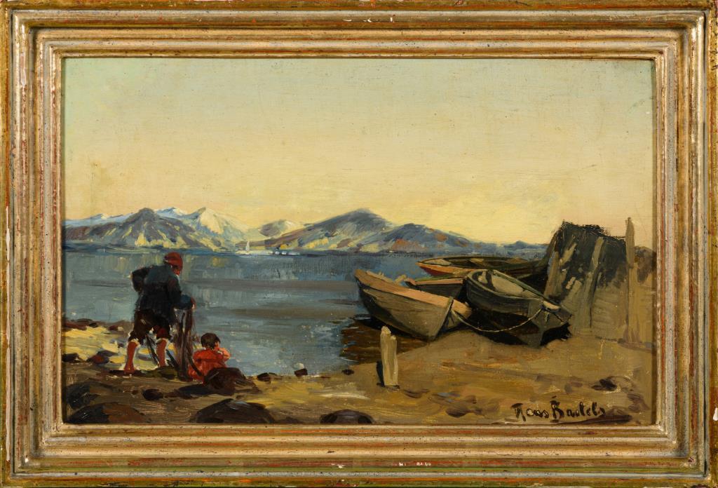 Ein Fischer mit Kind nahe dem Ufer bei den Booten im Sonnenschein und mit Blick über die Bucht.