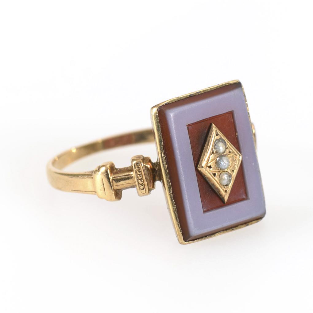 Zargengefasster Sard-Onyx mit 3 Saatperlchen, zwischen schmaler Schiene.
