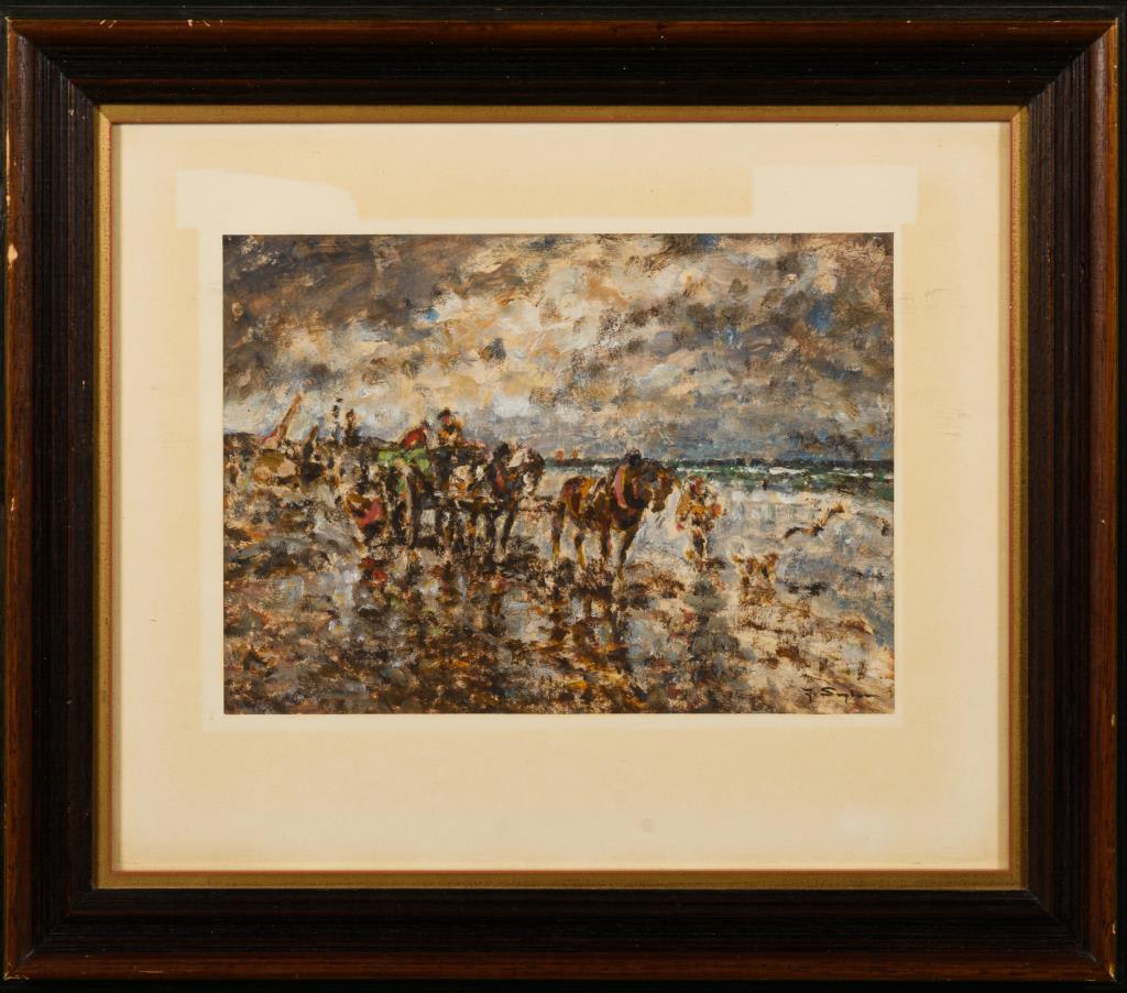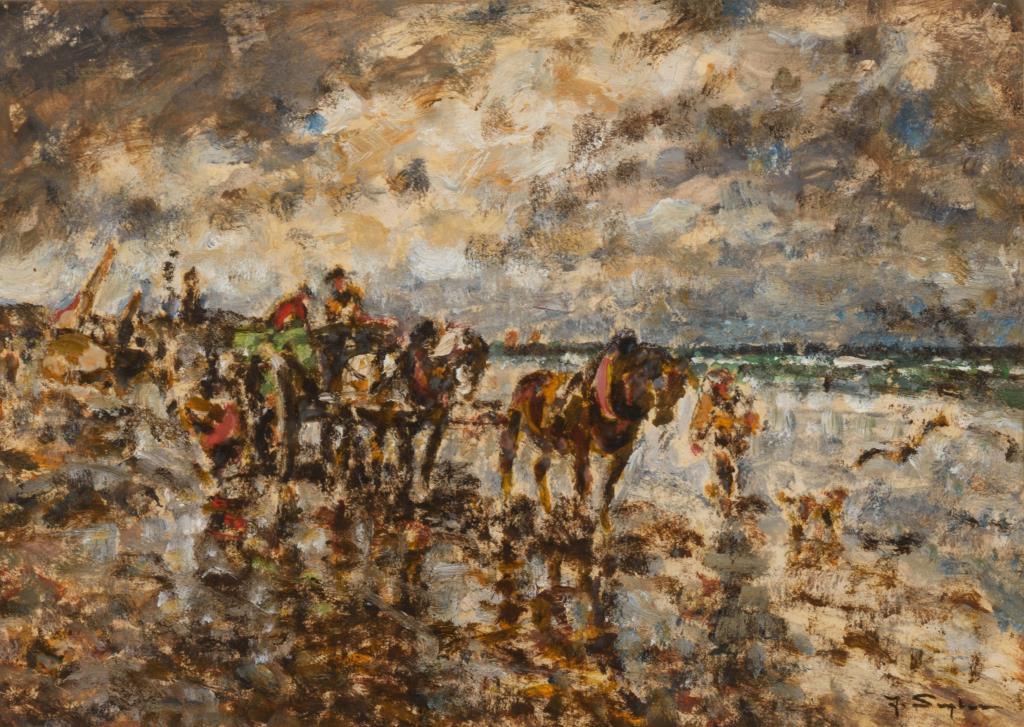 Die Fischer mit dem Pferdewagen am Strand.