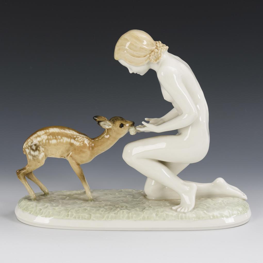 Auf einem Rasensockel kniender Akt einer jungen Frau, einem Rehkitz Blumen fütternd.