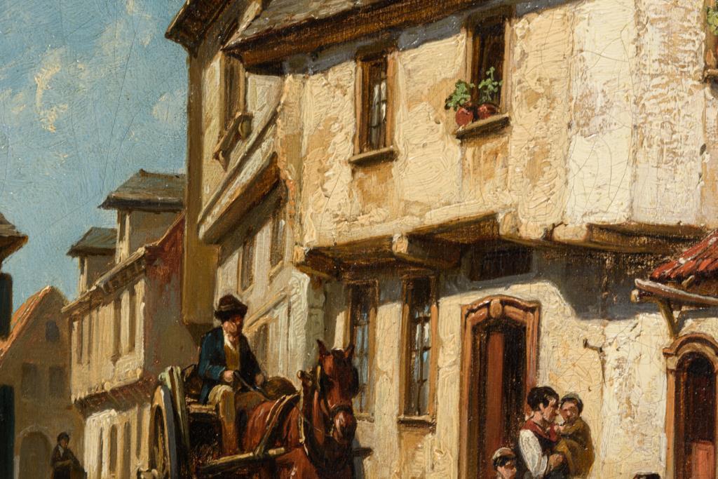 Fuhrwerk auf der Straße nahe einer Familie mit Hund vor dem Haus. Leichte Altersspuren.